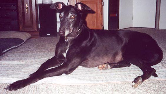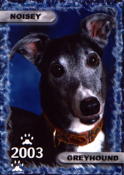 | Noisy Best Le# 19554 Re# 62B Whelped: 23 June 1992 Adopted: 18 January 1997 Angel: 1 January 2005 Raced at Orange Park FL and Wheeling WV Sire: Noisy Noise (Brindle) Dam: Model Sally* (White & Black) Littermates: Bundle of Noise, Black Female Disco Noise, Black Male Noisy Be Gone, Brindle Female Noisy Best, Black Male Noisy Fire, Black Male Noisy Gambler, Black Male Noisy Trumpet, Black Female Un-Named, Male, "D" Pup If you know the whereabouts of any of these littermates, please contact izofawoman@aol.com |